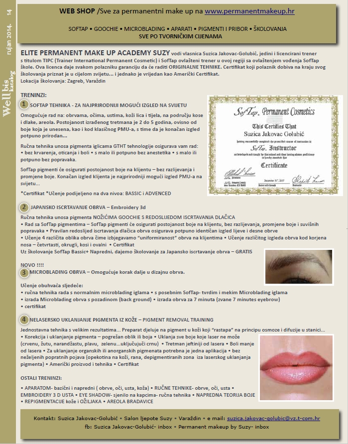 Salon ljepote SUZYRuđera Boškovića 4 b, 42000 VaraždinMobilni: 091 566 3328 E-mail: salonljepotesuzyvz@gmail.com Web stranica: www.permanentmakeup.hr